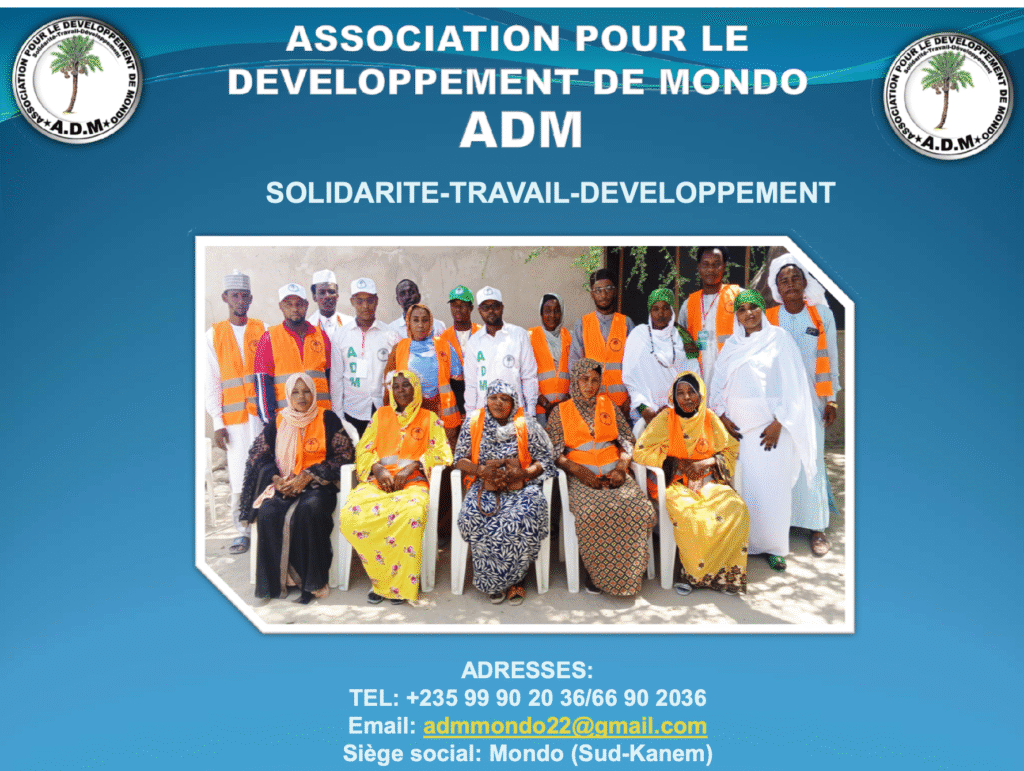 Fondée en 2012, l’Association pour le Développement de Mondo (ADM) incarne l’espoir d’une jeunesse dynamique et engagée pour le progrès du Sud-Kanem, au Tchad. Sous la direction d’Ali Younous Ali, journaliste et leader visionnaire, l’ADM mène des actions concrètes en faveur de l’éducation, de la santé, de la paix sociale et de la lutte contre le changement climatique.