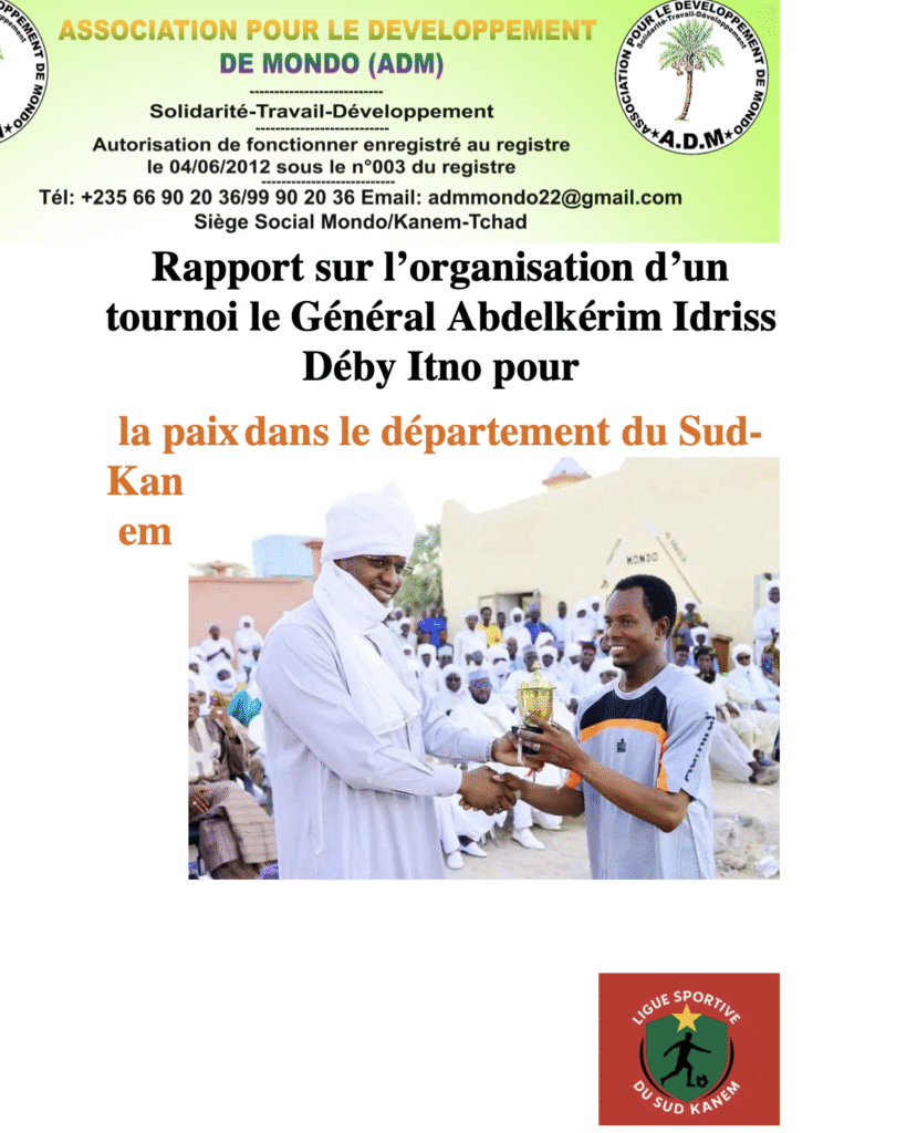 L’Association pour le Développement de Mondo (ADM), à travers la sous-ligue de football du Sud-Kanem, a organisé le tournoi ABDELKERIM IDRISS DÉBY ITNO du 20 septembre au 4 octobre 2025 au terrain Al Abassia de Mondo.